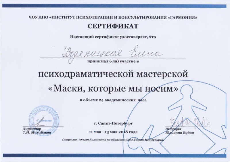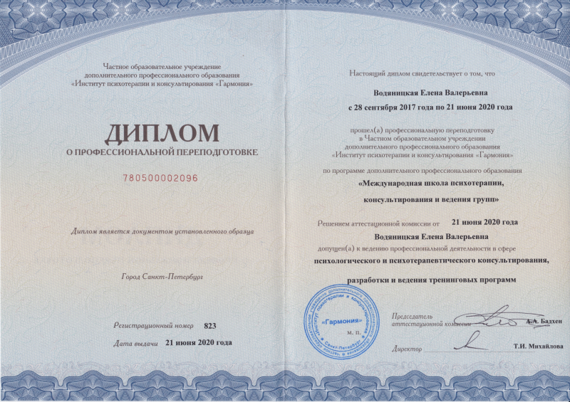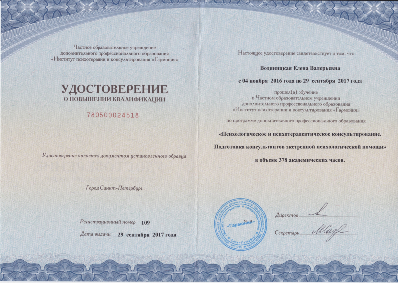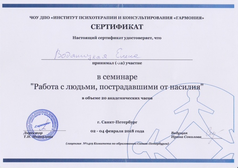 - Международный институт психотерапии и консультирования "Гармония", Санкт-Петербург, консультант экстренной психологической помощи