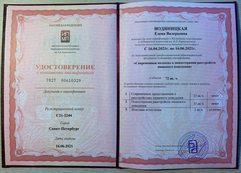 - Институт психотерапии и медицинской психологии им. Карвасарского, Санкт-Петербург,современные подходы к психотерапии расстройств пищевого поведения