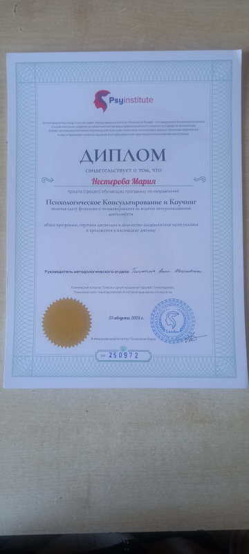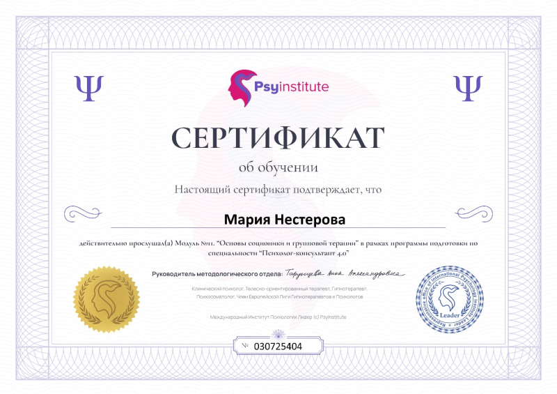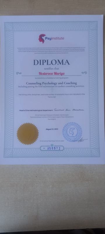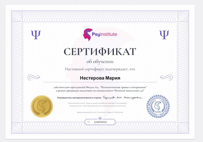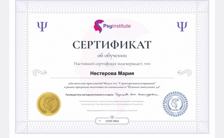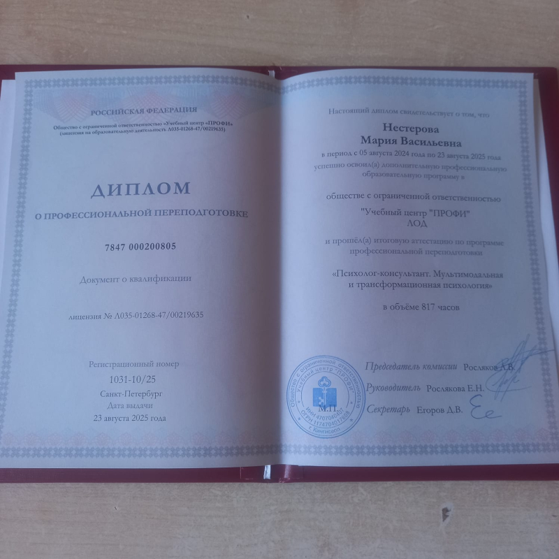 - Диплом о профессиональной переподготовке по специальности "Психолог-консультант. Мультимодальная и трансформационная психология"