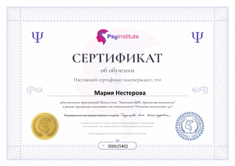- Дополнительные Сертификаты "Международного Института Психологии "Leader": "Структура консультирования", "Психологическая травма и интервенция", "Основы соционики и групповой терапии", "Психосоматика и перинатальная психология", "Анатомия ЦНС и кризисная п
