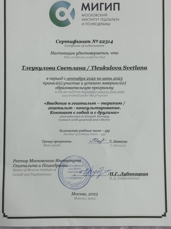 Я психотерапевт, работаю в подходах гештальт-терапии, транзактного анализа, гипнотерапии и НЛП. Веду индивидуальную терапию, консультирую подростков, родителей, женщин и мужчин. Работаю с темами самооценки, эмоционального выгорания, обид, детских травм, нарушенных границ, трудностей в отношениях и переживаний утраты. Помогаю людям всех возрастов лучше понять себя, научиться экологично выражать чувства, справляться с внутренними конфликтами и строить здоровые, поддерживающие отношения. Работаю бережно, глубоко и осознанно, с уважением к уникальному опыту каждого человека.