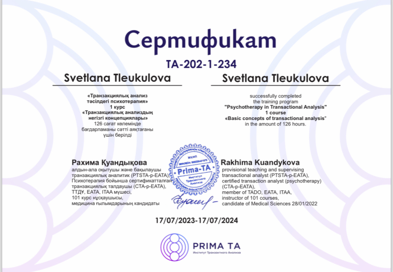 В своей работе я опираюсь на интегративный подход, сочетая несколько методов психотерапии в зависимости от запроса клиента. Использую гештальт-терапию — для осознания чувств, проживания эмоций и восстановления контакта с собой и окружающим миром. Транзактный анализ помогает понять внутренние роли, сценарии и шаблоны поведения, формировавшиеся с детства.